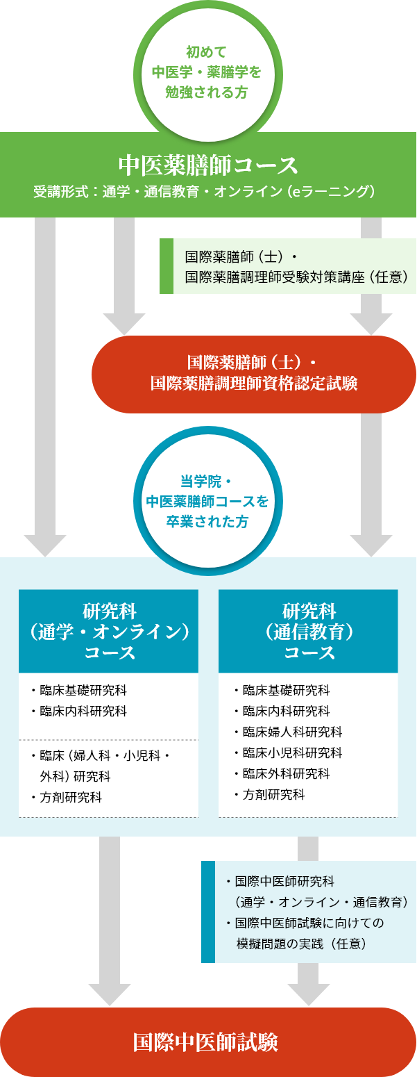 本草薬膳学院のコースは、はじめて薬膳を学ばれる方向けの「中医薬膳師コース」と、スキルアップや上位資格の取得が目標の「研究科コース」の2つに大きく分かれています。