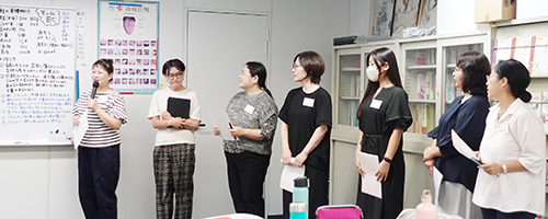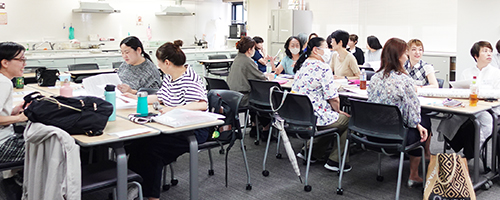 課題となる症例についてグループで相談しながら弁証施膳し、当日午前中に講師の前で分析結果と提案したレシピを発表します。発表後は河村 彩子 先生、講義担当の猪俣 俊成 先生、実習担当の岡尾 知子 先生の講評が行われました。