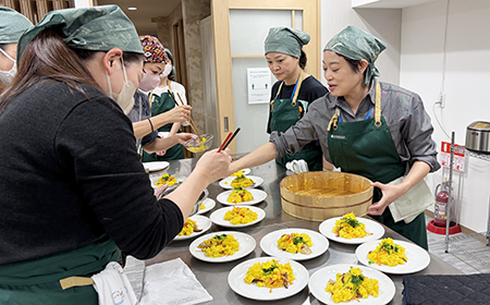午前中の授業は2階の教室、午後の実習は1階奥の調理室で、「春の薬膳」メニューを皆で調理、試食いたしました。
