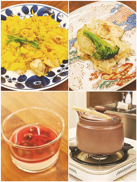 午後の調理実習では、午前の学びを踏まえ季節の食材を使った薬膳料理を4品作成しました。食材の効能を意識したメニュー構成や、調理のポイントを講師が丁寧に解説し、受講生同士が協力しながら実習を進める姿が見られました。