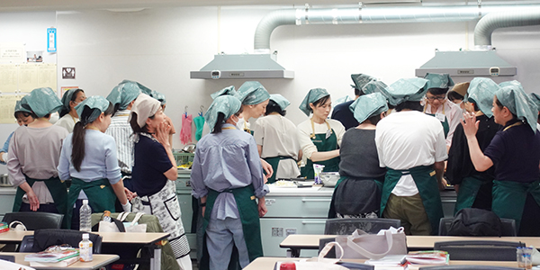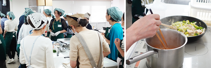 午後の調理実習では、午前の学びを踏まえ季節の食材を使った薬膳料理作成に挑戦しました。食材の効能を意識したメニュー構成や、調理のポイントを講師が丁寧に解説し、受講生同士が協力しながら実習を進める姿が見られました。